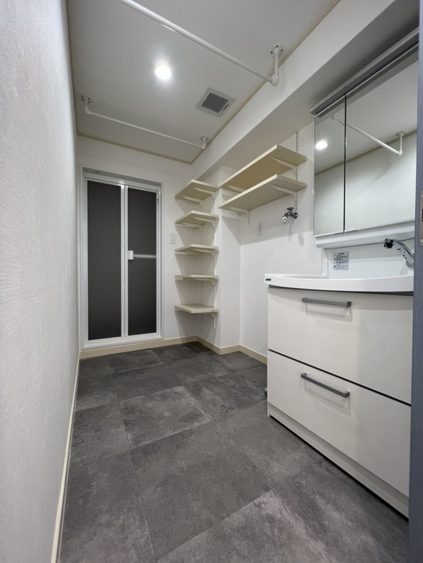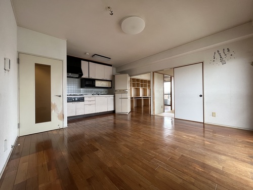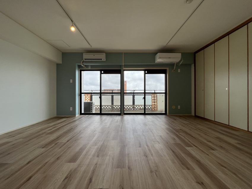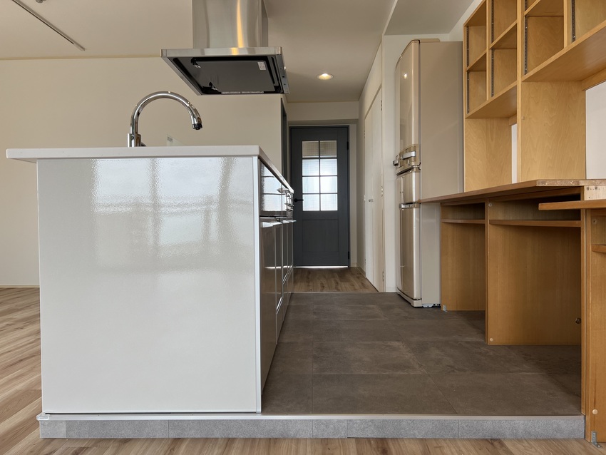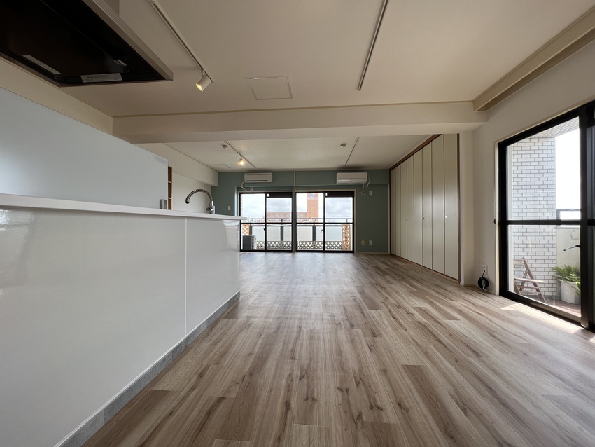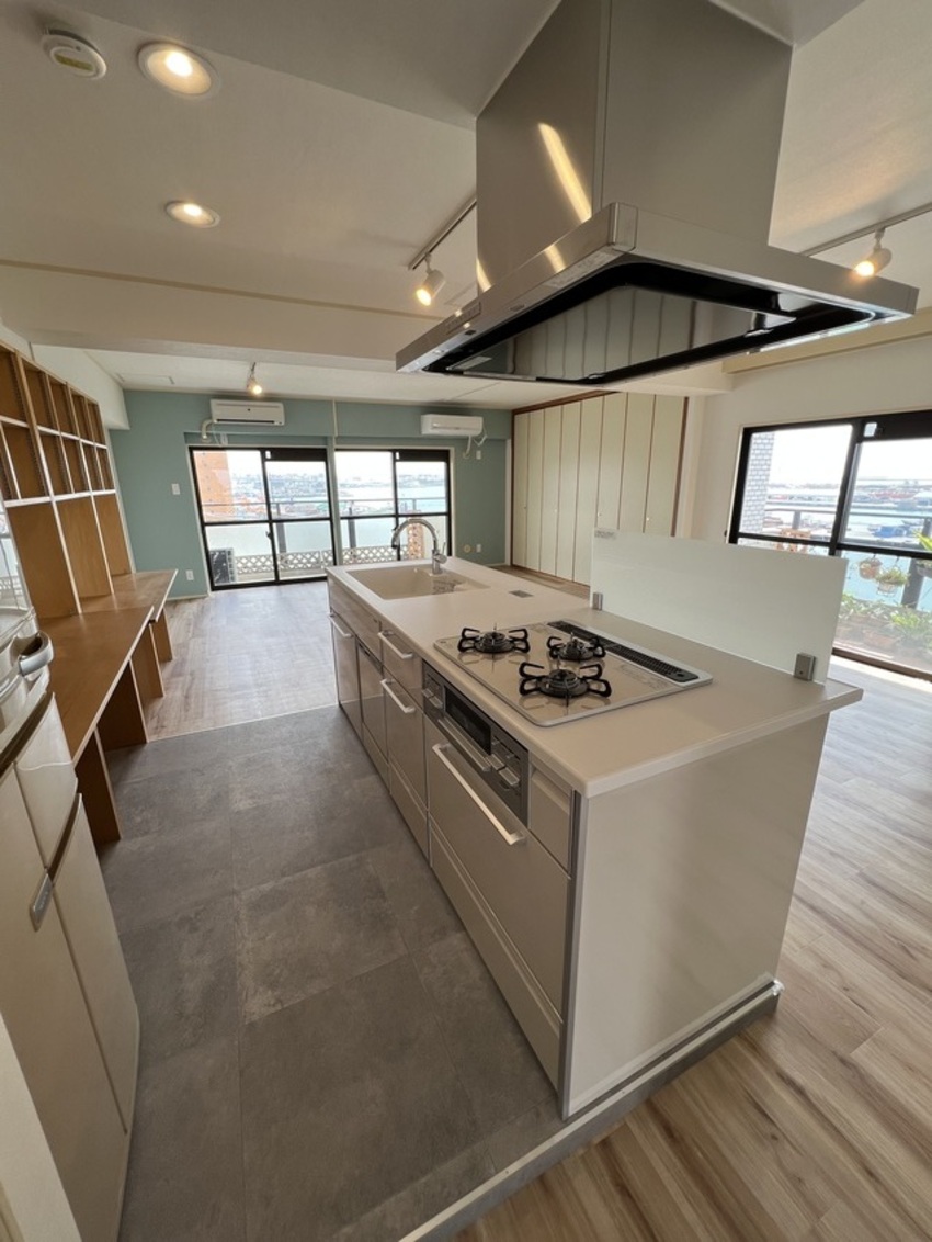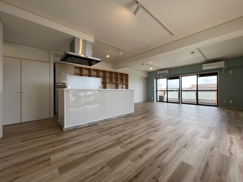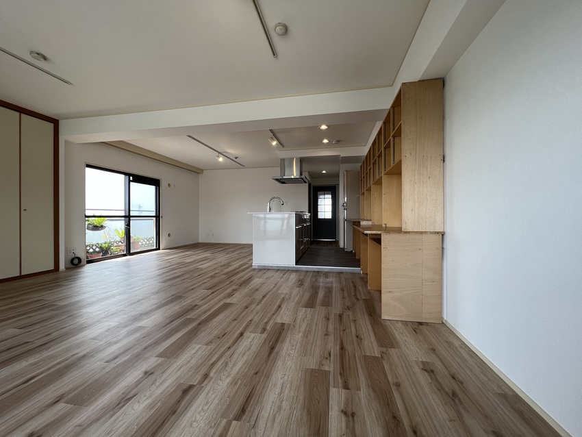 築35年のマンションをリノベーション!3LDKだったお部屋を1LDKにしリビングを広くしました!全体的に白を基調としアクセントでサワーグリーンを使用!キッチンはアイランド型に変更し、料理しながら西海岸を眺める事ができます!洗面室と洋室にはお客様から要望のあった可動式造作棚を設置しています。