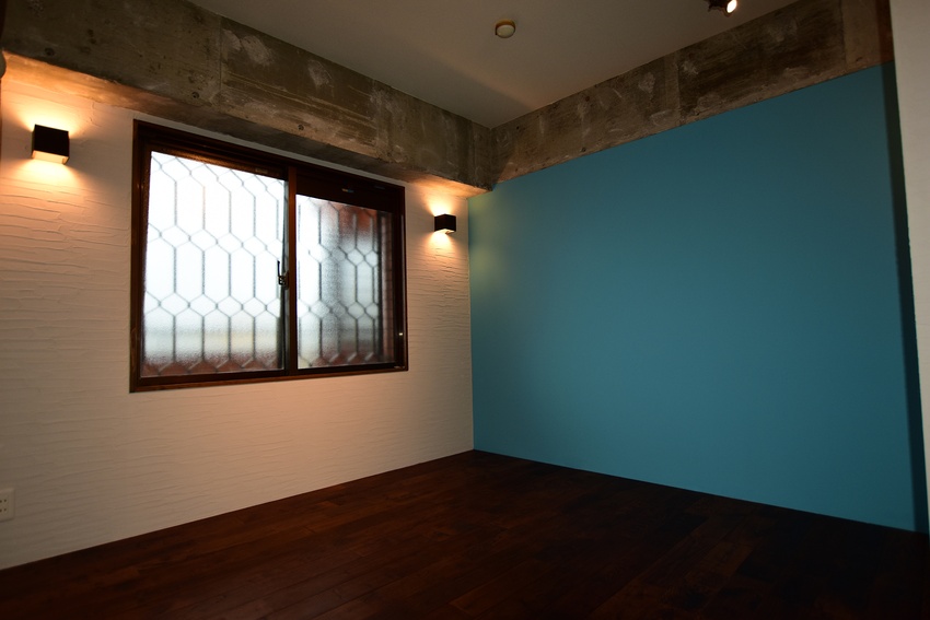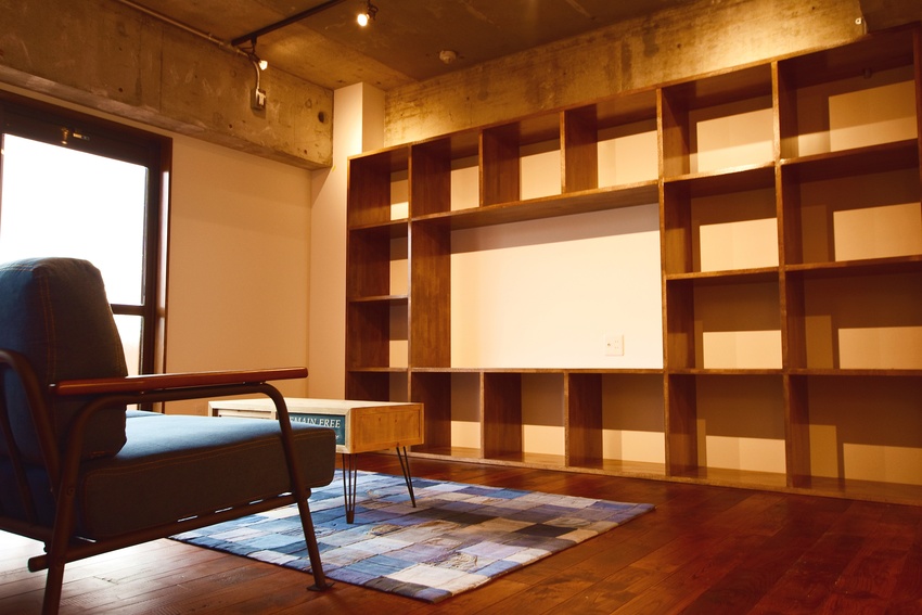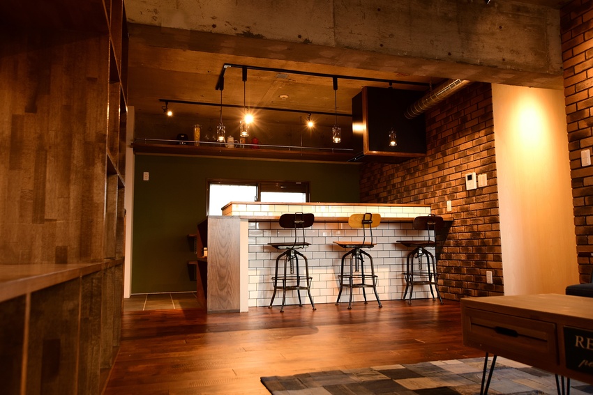 築36年のマンションをリノベーションしました。もともと3LDKの間取りでしたが、2LDKに変更し広々とゆったり寛げる空間にしました。内装デザインにもこだわり床は天然無垢材、天井はあえて建物躯体むき出しの打ちっぱなしに。キッチンはカウンターを作りおしゃれなBARのような作りにしました。