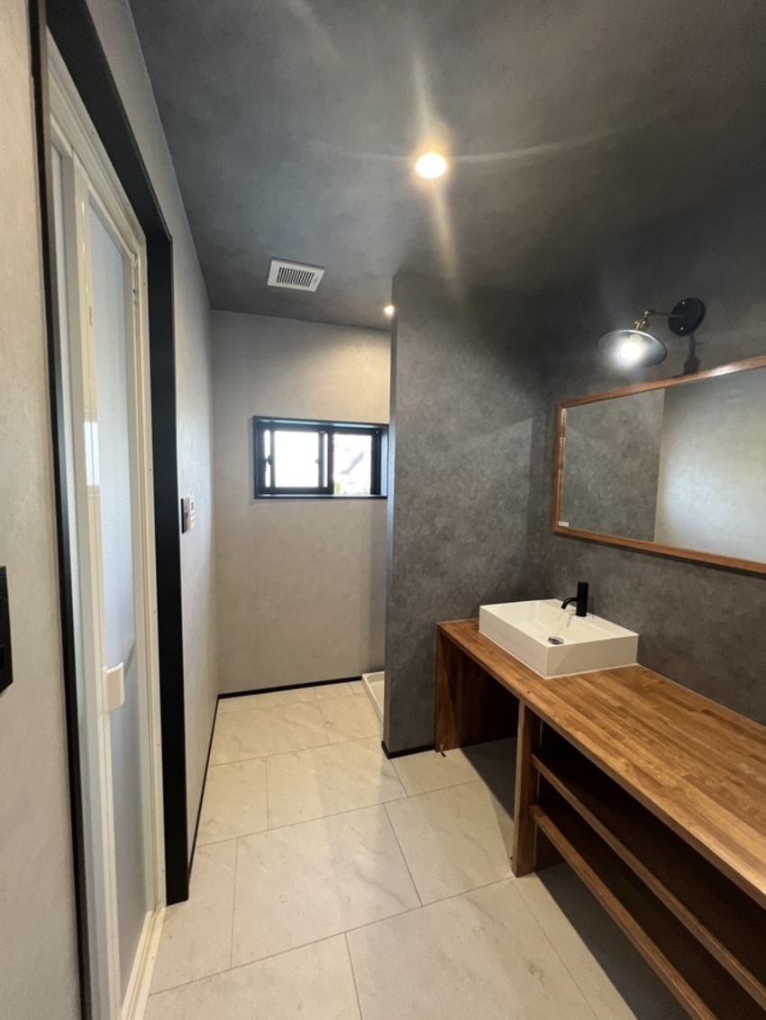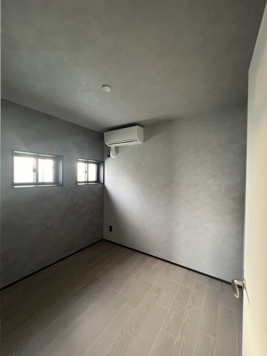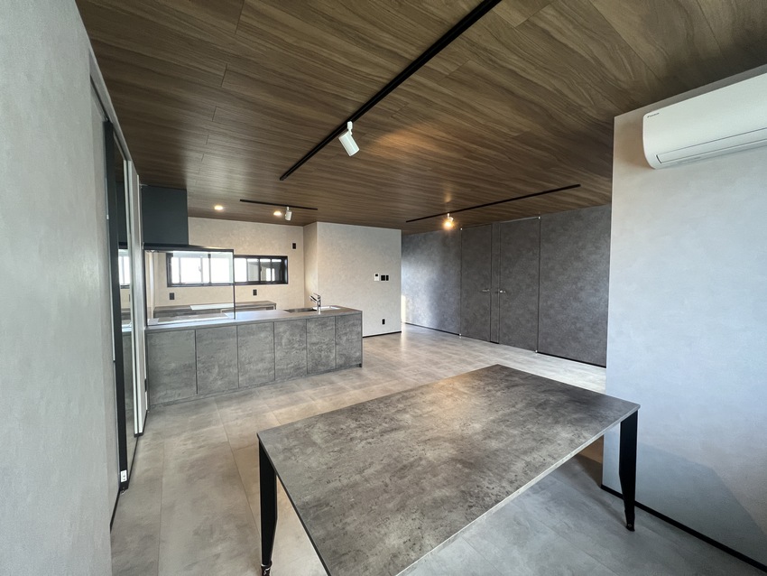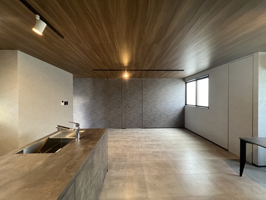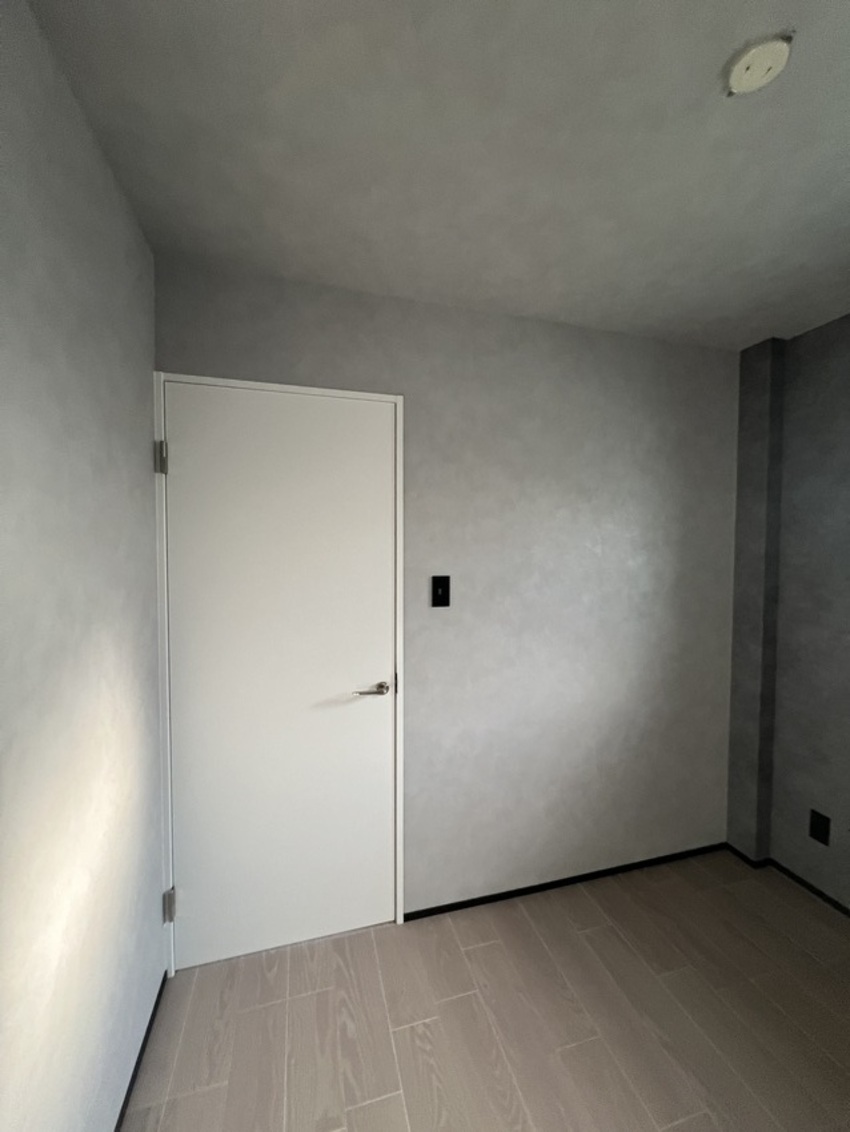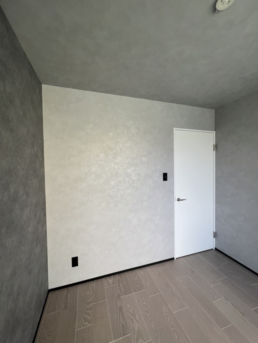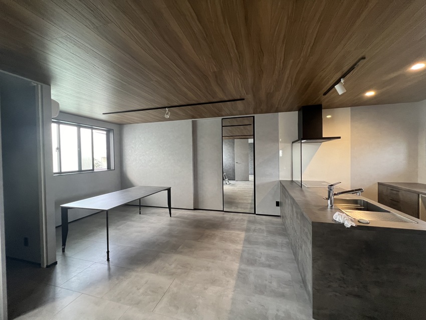 元々アパートだった2部屋をリノベーションして1つの住宅にしました。全体のカラーをグレー系で揃えクールな仕上がりに!!クロス仕上げのドアを使用し、壁と同じクロスで仕上げることで一体感をだしてます。