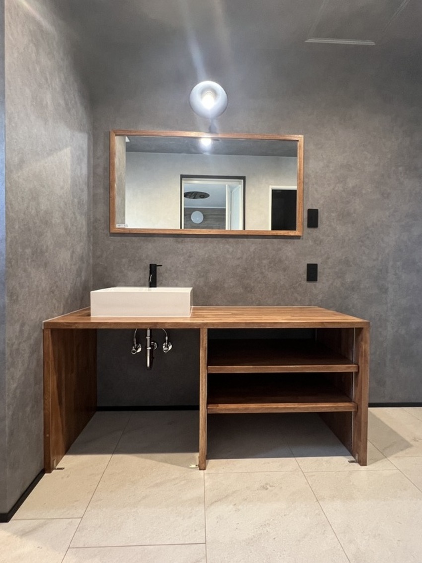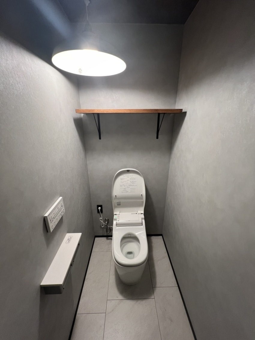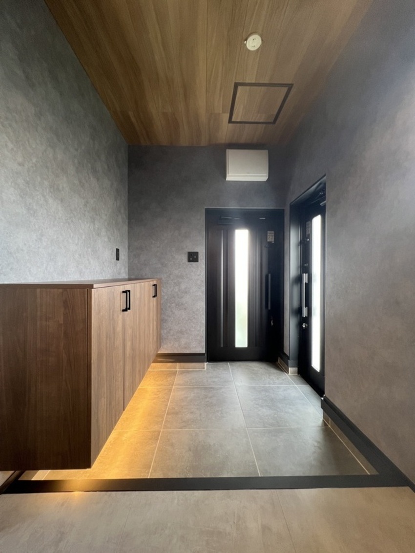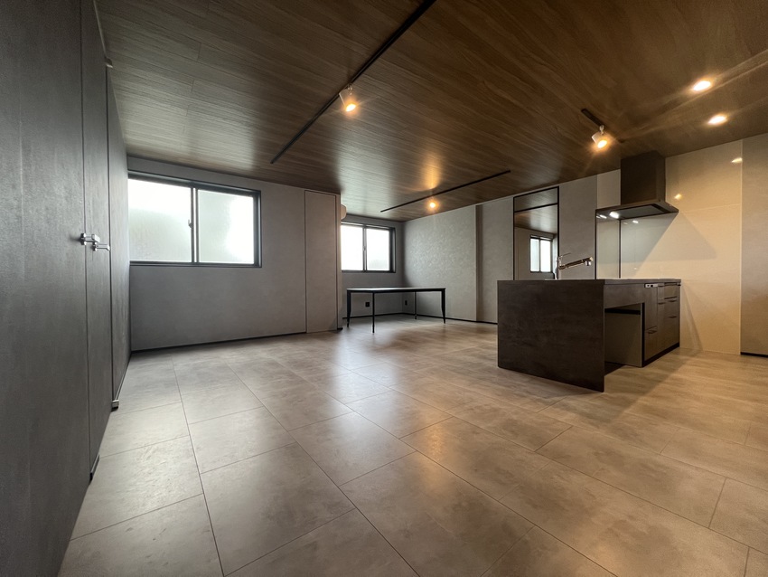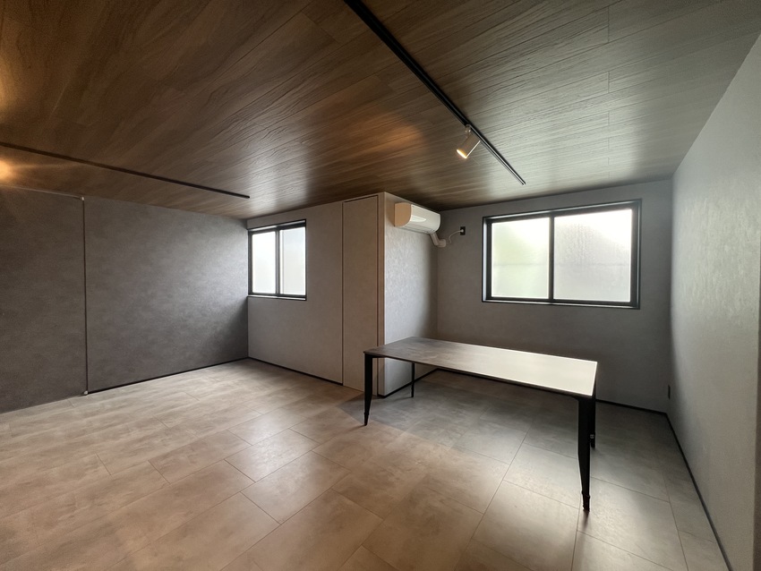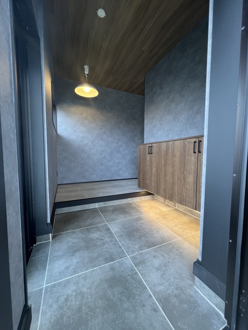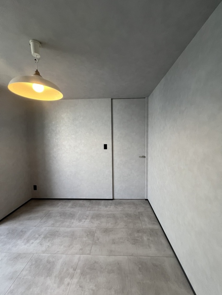 元々アパートだった2部屋をリノベーションして1つの住宅にしました。全体のカラーをグレー系で揃えクールな仕上がりに!!クロス仕上げのドアを使用し、壁と同じクロスで仕上げることで一体感をだしてます。