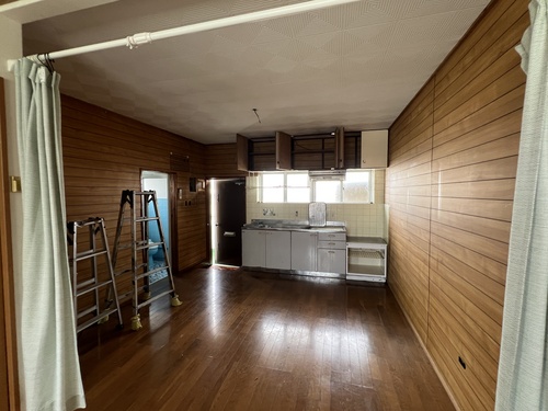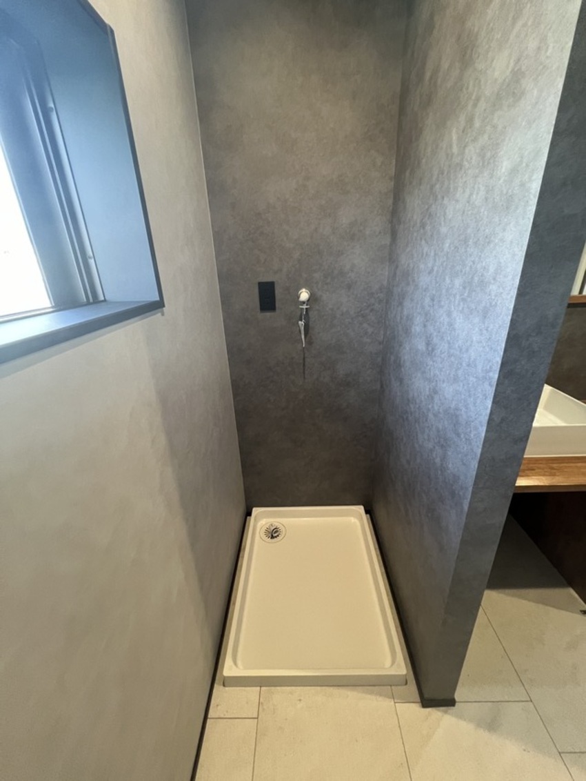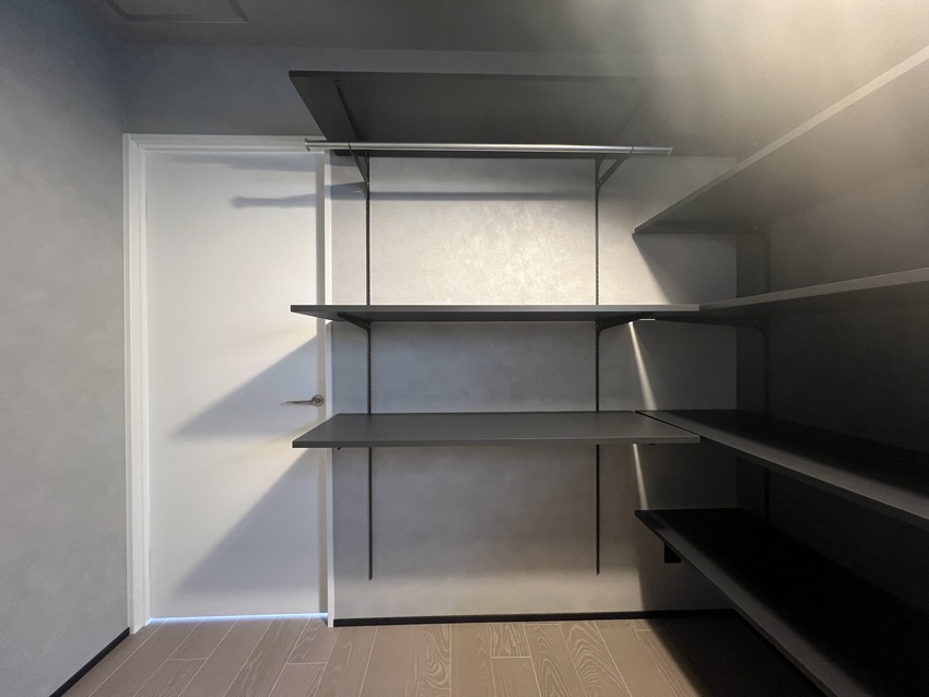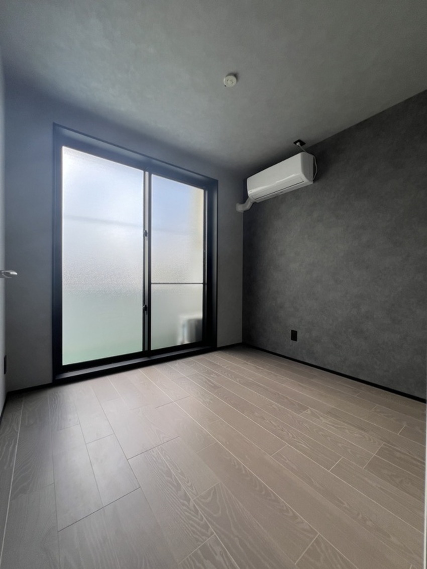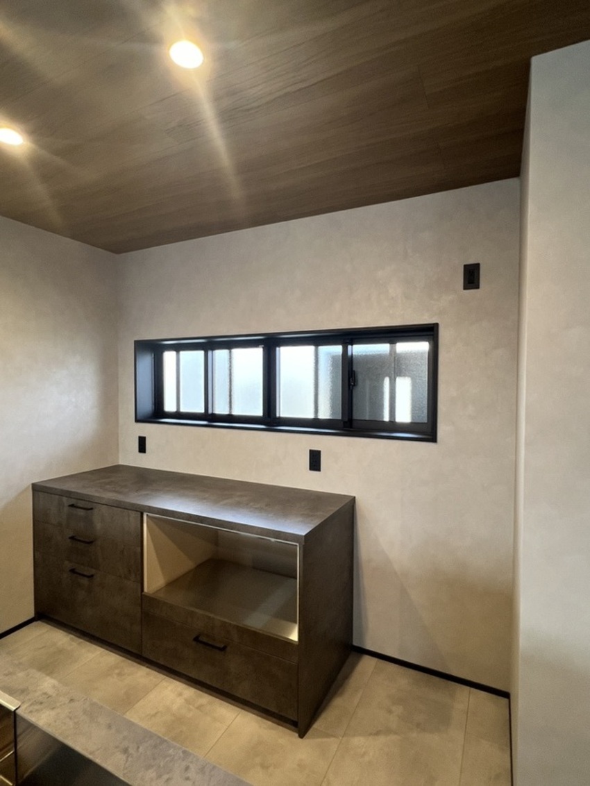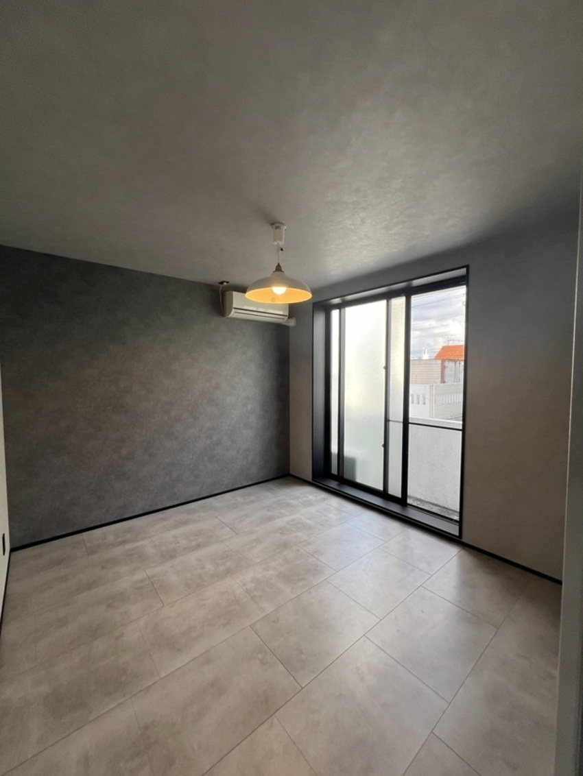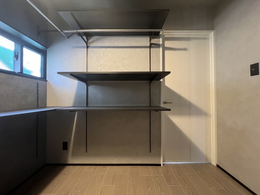 元々アパートだった2部屋をリノベーションして1つの住宅にしました。全体のカラーをグレー系で揃えクールな仕上がりに!!クロス仕上げのドアを使用し、壁と同じクロスで仕上げることで一体感をだしてます。